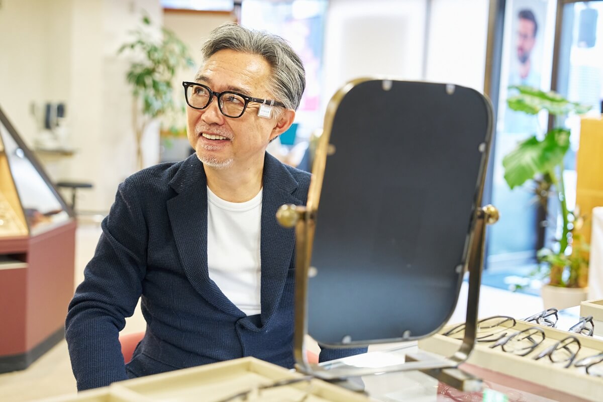 フレームを選ぶ際にも、意見をたくさんいただき、これまでのように自分の主観だけで選ぶのとは違いました。一人だけで選ぶと無意識の同じようなフレームを選びがちですが、他人からの見え方を客観的にアドバイスしていただきながら、固定概念なしに選べたので、こういうショップの存在は非常にありがたいですね。