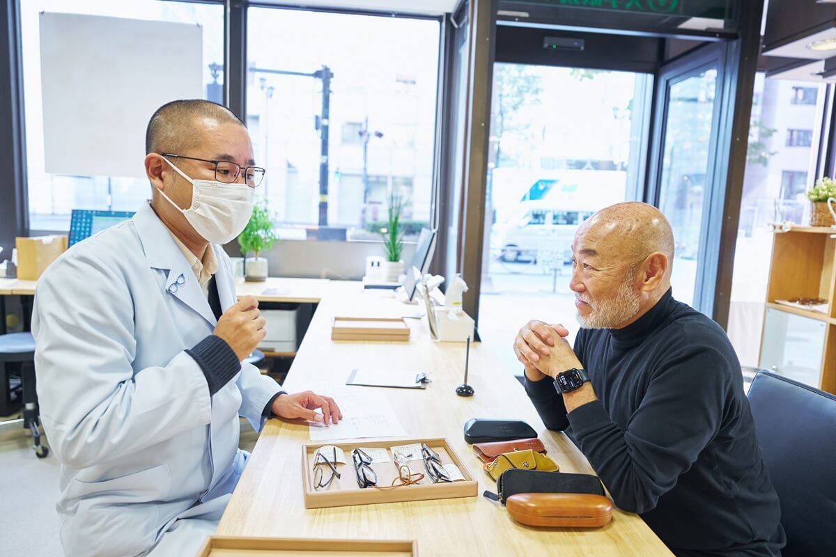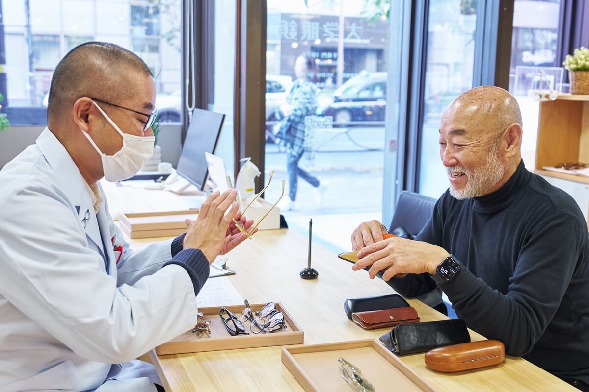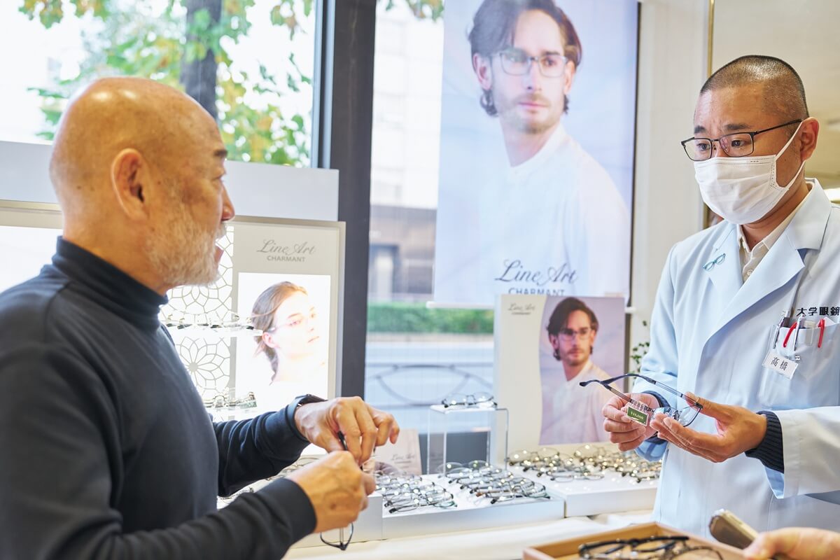 そんな名児耶様が、より快適に日常生活を送り、仕事でもストレスなくいろいろなものが見れる眼鏡をつくるために、まずは半蔵門にある店舗にて、ヒアリングと検査を行うことで最適なレンズを選定し、さらにお好みのフレームをじっくりと選んでいただきました。
