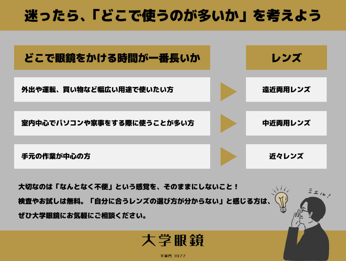 まずは「どこで眼鏡をかける時間が一番長いか」を基準に選ぶのがオススメです。基本的には以下のように考えてみましょう。
