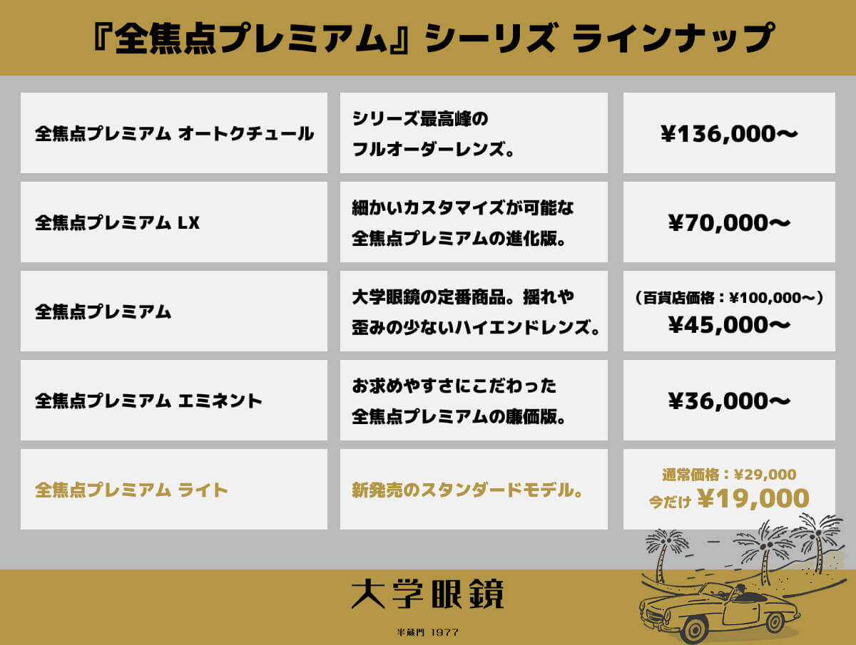 1997年の発売依頼、大学眼鏡の定番商品として、多くのお客様に生活の必需品として選ばれ続けてきた『全焦点プレミアム』のエントリーモデル。遠近両用はもちろん、中近、近々を加えた3タイプからお選びいただけます。
