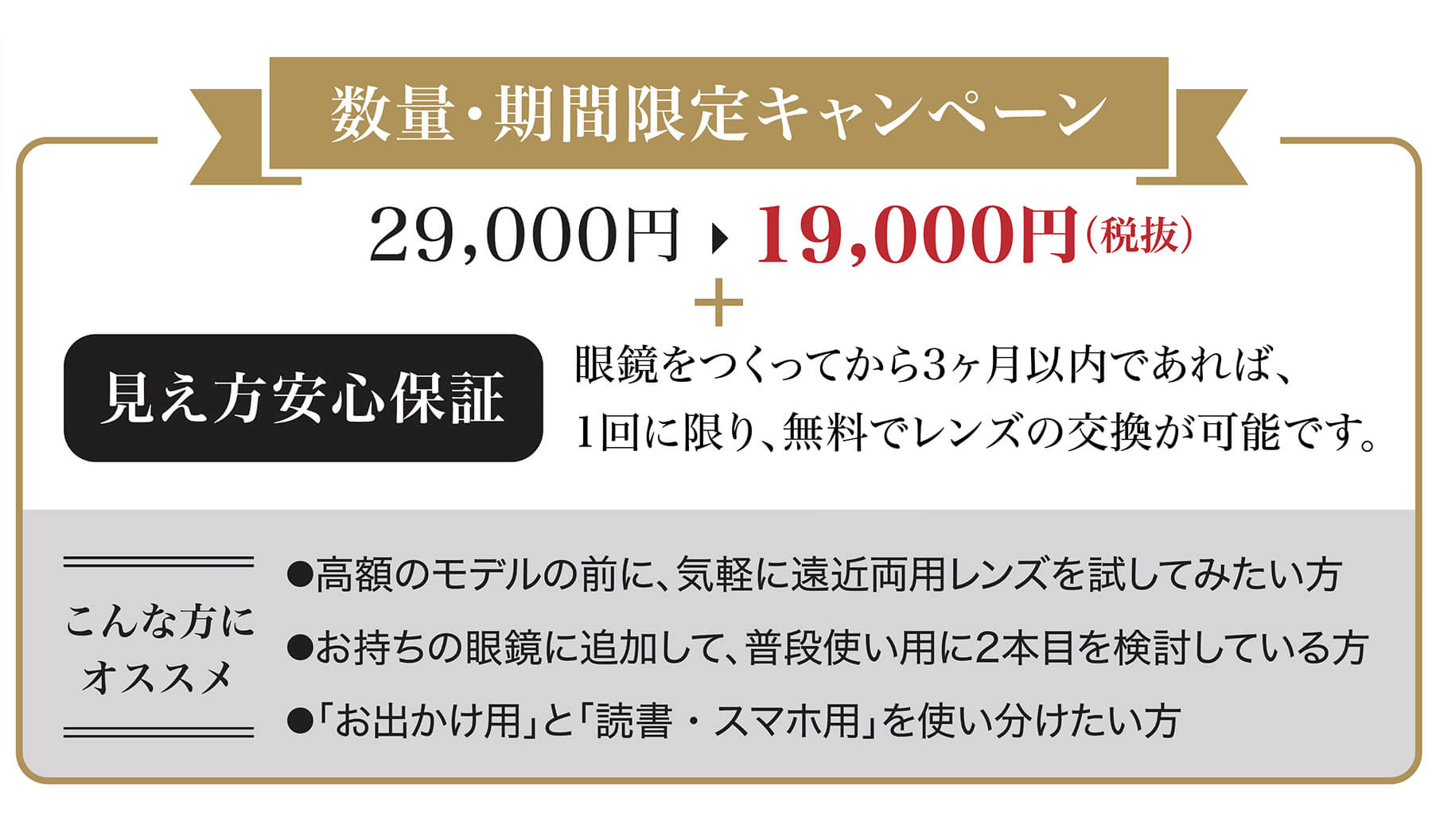 しかも今なら3ヶ月間の「見え方安心保証」つき。眼鏡をつくってから3ヶ月以内であれば、1回に限り、無料でレンズの交換が可能です。