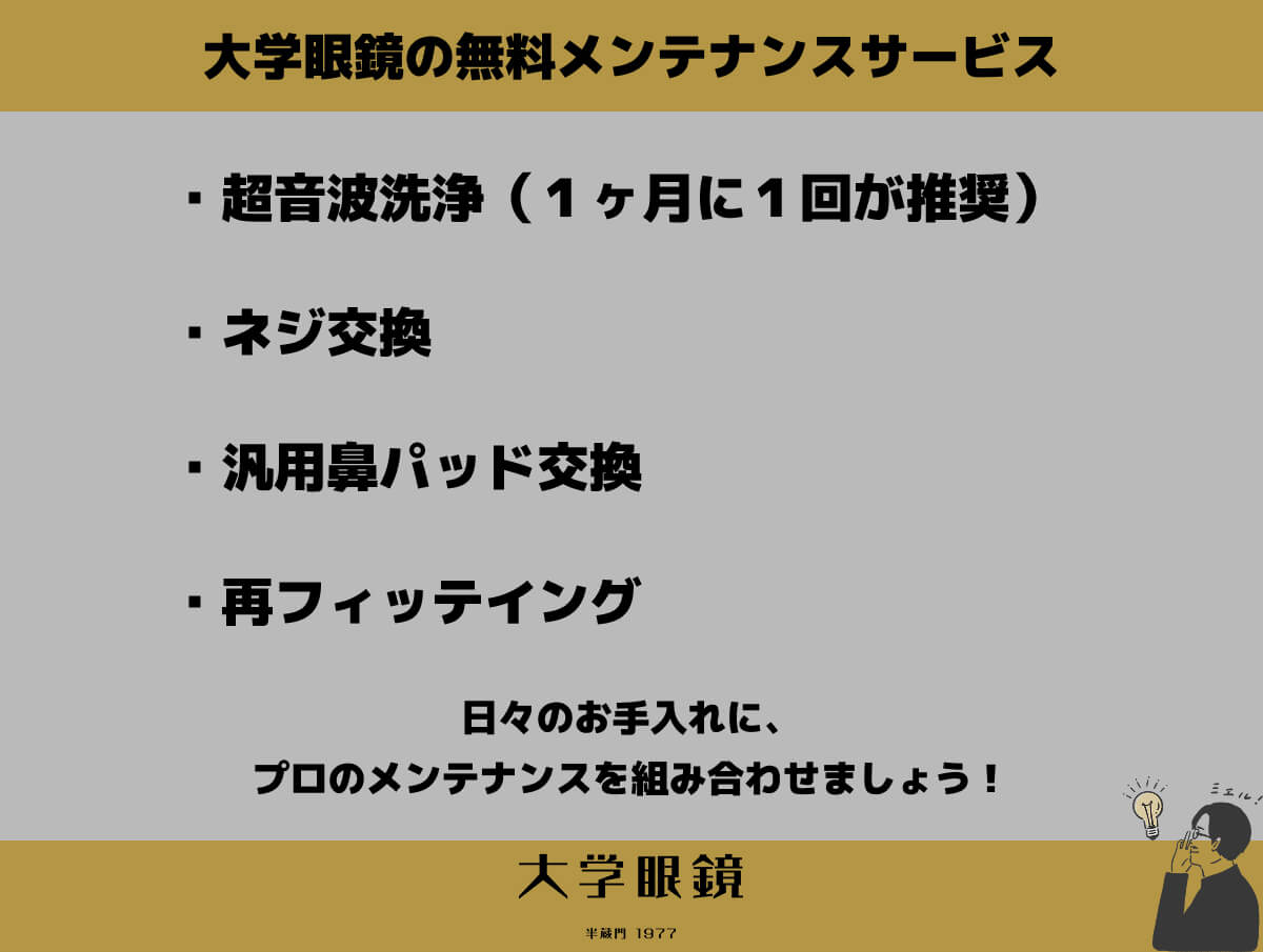 汗や皮脂が腐食の原因となりますので、帰宅後に水洗いをして、しっかりと水分を拭き取るようにしましょう。また鼻パッドの汚れは超音波洗浄が効果的。こちらも大学眼鏡のような専門店に相談してください。