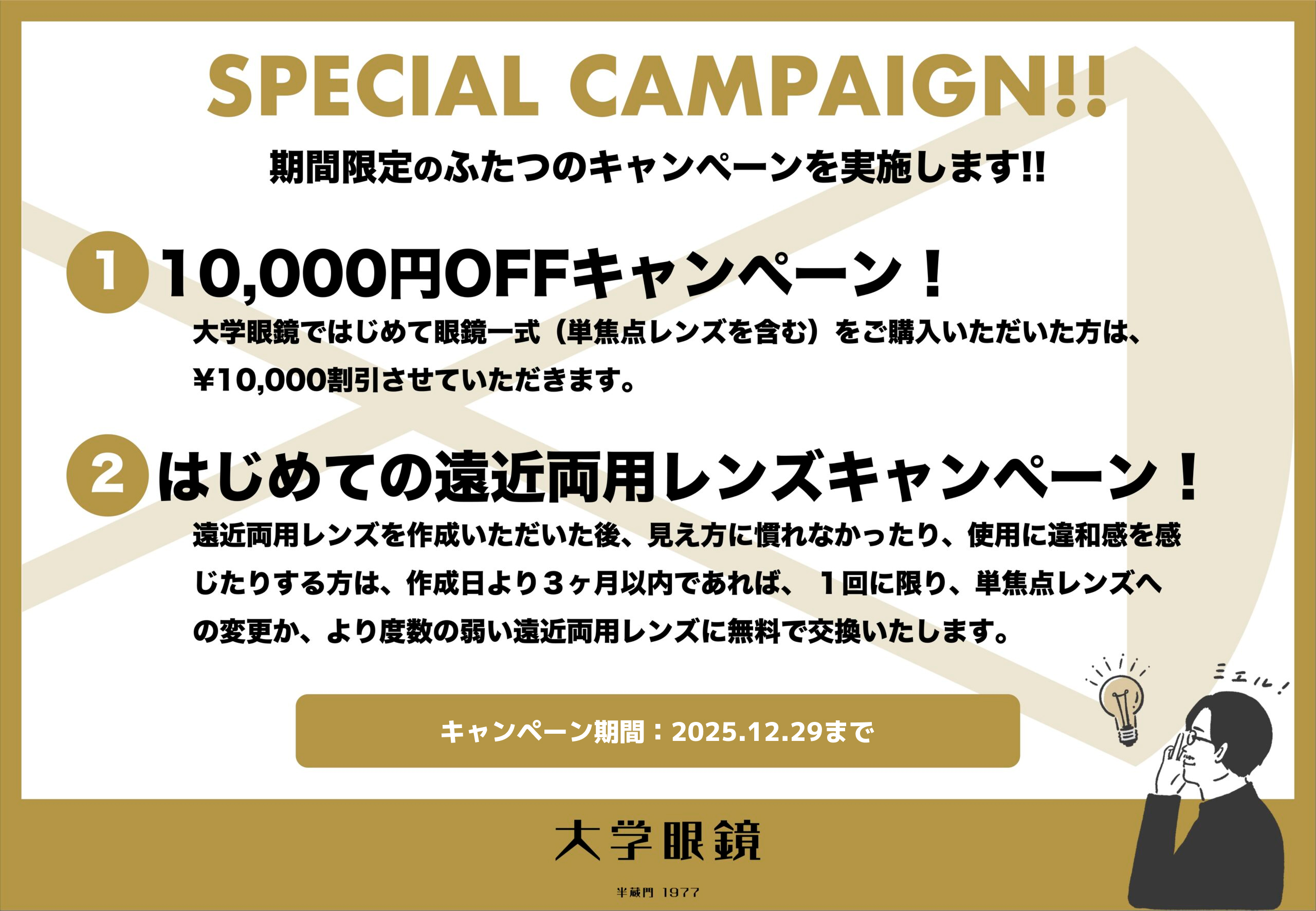 大学眼鏡では、ふたつのキャンペーンを行います(12月29日まで)