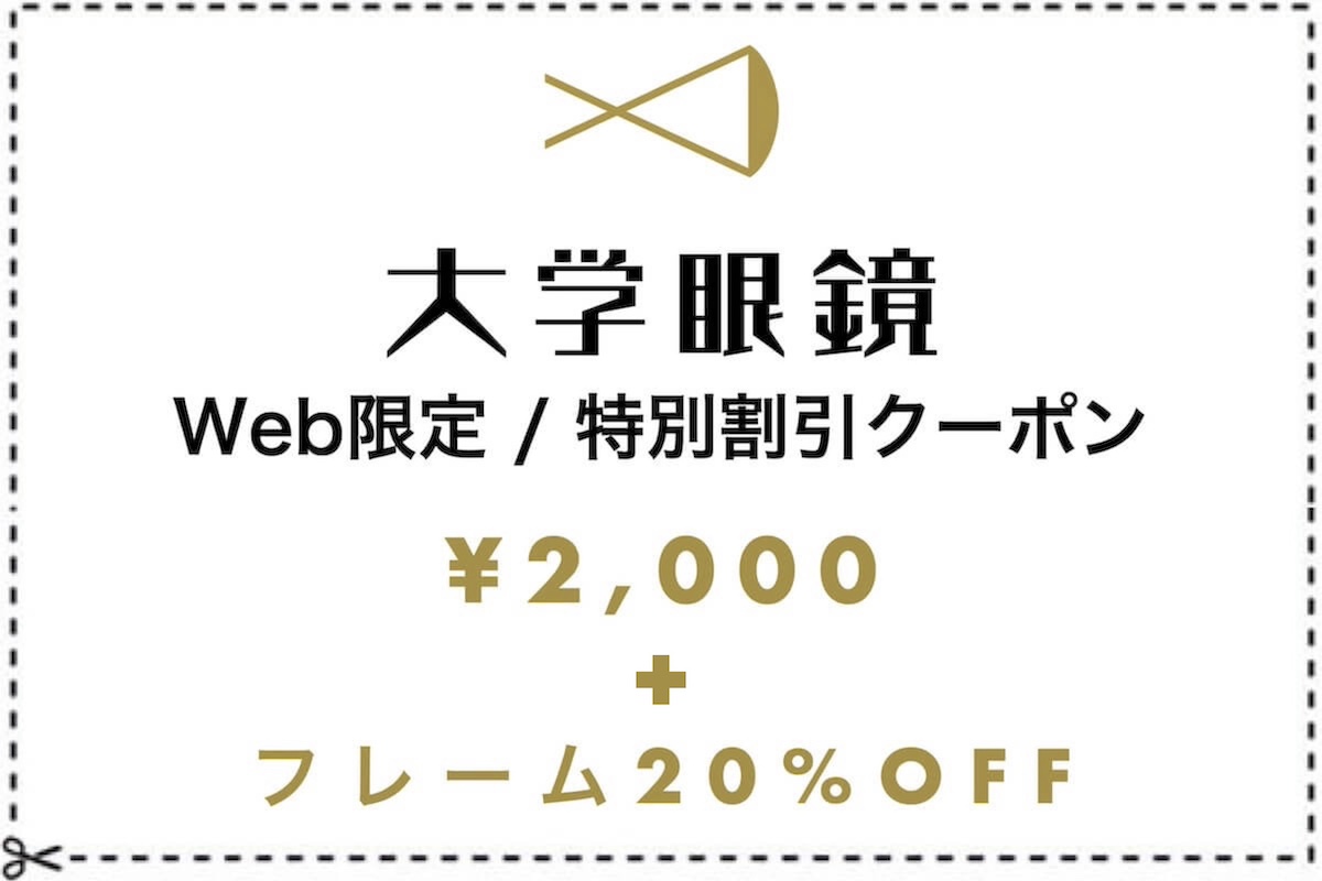このページをプリントアウトしてお持ちいただくか、ご来店時にスマートフォンなどの画面でクーポンをご提示いただくと、メガネの購入が2,000円引きに、さらにお選びいただいたブランドフレームが20%オフの特別割引となります。